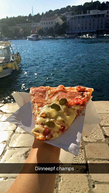 We left around 4 PM and sat in the middle of the boat to avoid getting soaked on the way back. Ryan was really hungry so, instead of doing dinner at a restaurant, we grabbed two slices of pizza in the harbor and ate while we watched people in the square. I tried to Snap my pizza with a clever “Dinner of Champs” title but my wine-influenced spelling led to a pretty funny typo that I thought was too hilarious not to reference the entire rest of the night…