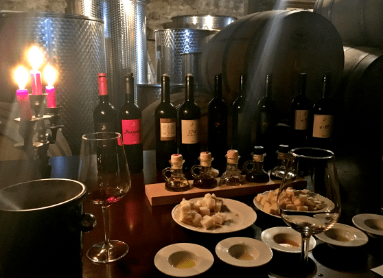 We finally arrived at our second winery and were led down to the basement barrel room. Again, talk about romantic! Our table was among the barrels of wine and it had red candles, wine, cheese, and an assortment of olive oil all made in Hvar for us to taste.