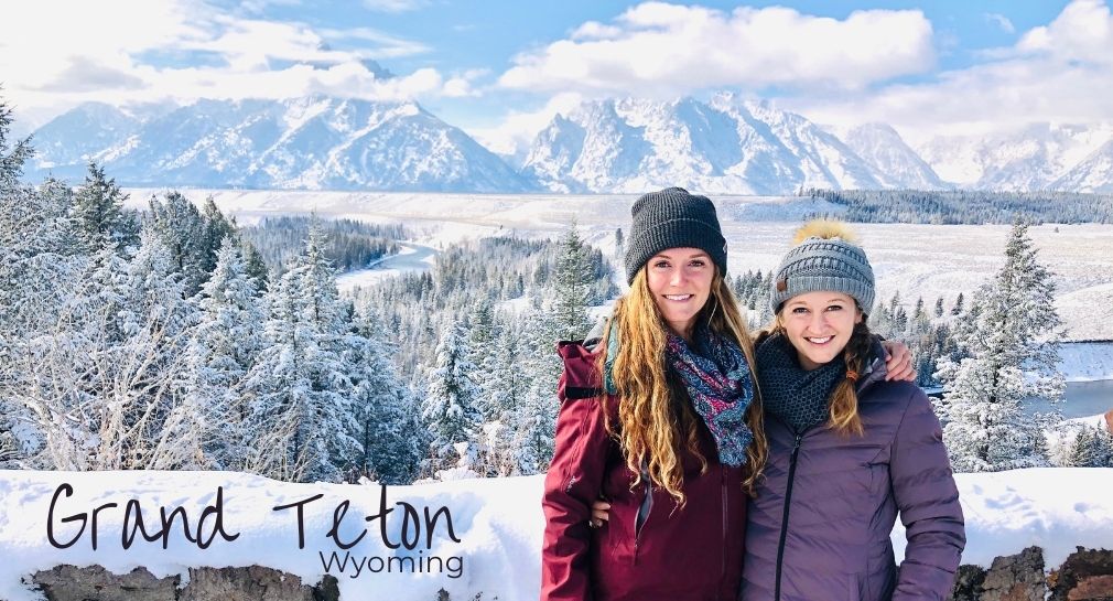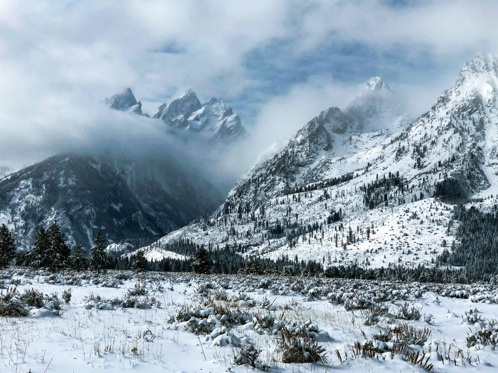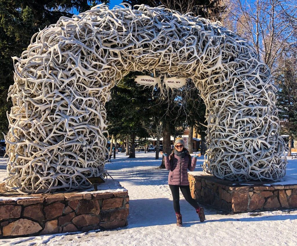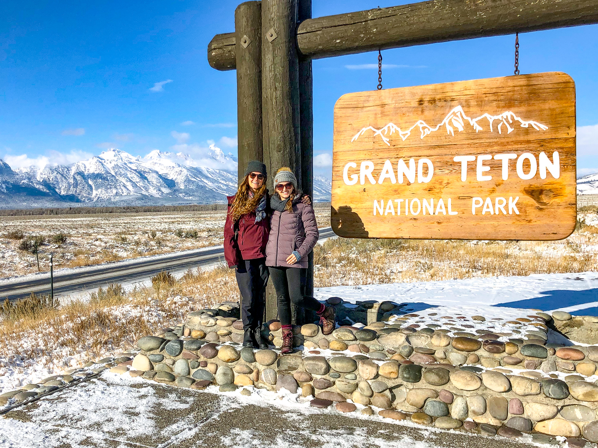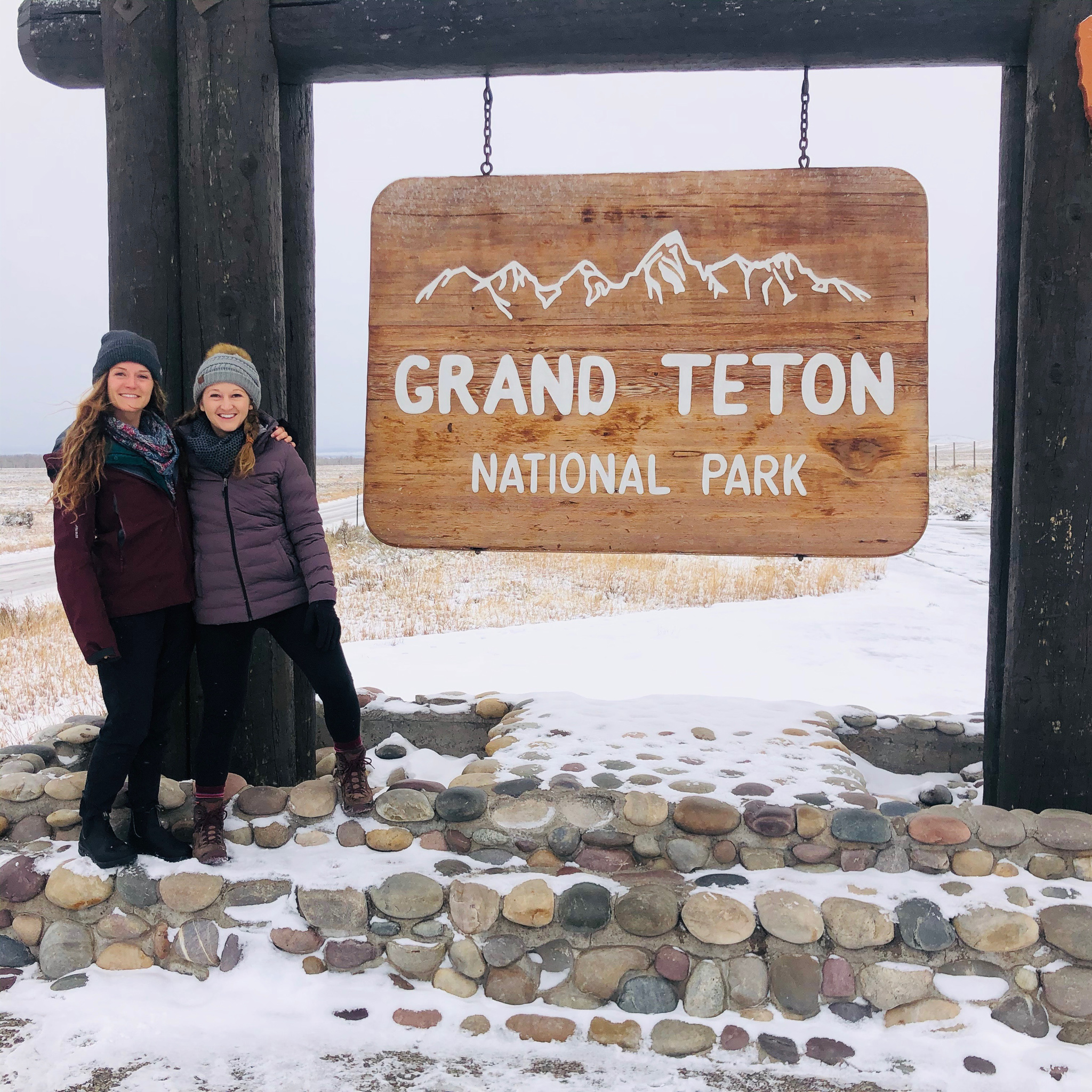 The road down to Jackson Hole was foggy but not enough to hide the moose crossing the road! It was our first animal siding of the trip and we were very excited! We drove into Jackson and found a parking lot to meet our guide Mike. Mike was referred to me by a good friend that I used to work with who had absolutely raving reviews about his tour with Mike. Mike was really nice, wore a mask, and drove us so we could enjoy the views. He had a fascinating story of how he moved from Florida with his family to Wyoming after being so love with the State. Along our drive the mountains weren’t showing because of all of the overcast clouds but it was still a beautiful site with all of the snow. We found the Grand Teton National Park sign and took a photo at the beginning and end of our trip. The difference in visibility was crazy!
