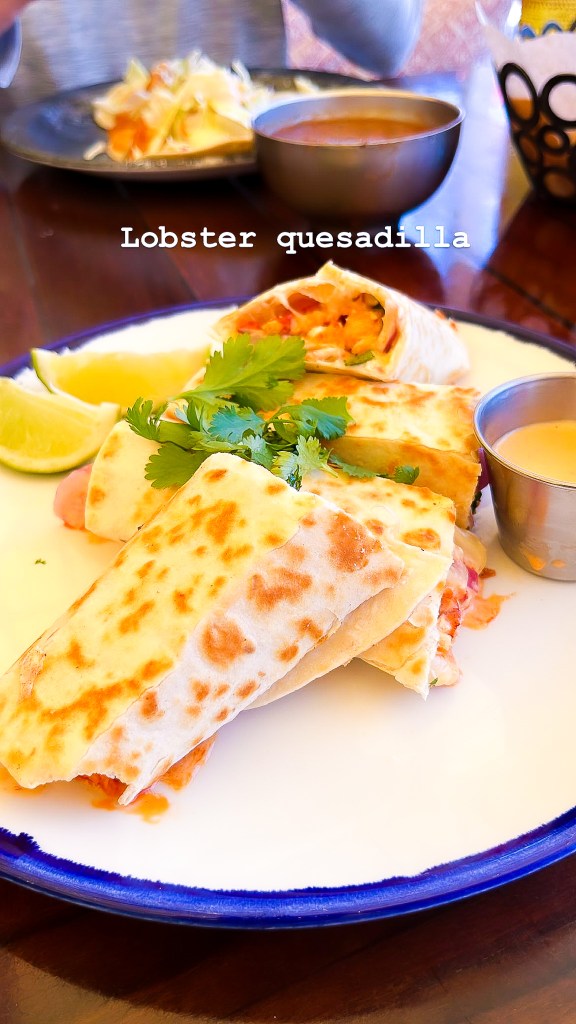 We had noon reservations at a Mexican place called Lona which was just down the beach from our hotel. We took a short walk over and got a table looking out at the water. We had some passion fruit margaritas and I decided to try something new. Instead of my usual carnitas taco order, I went with the lobster quesadilla. OH MY GOSH. This quesadilla was one of the best things I’ve ever eaten. It was stuffed with huge chunks of lobster, pickled red onion, cilantro, the perfect amount of cheese, and this super yummy southwest sauce. Even as I write this, I want it again! (Spoiler, we went back so I could have it again). Ugh, so good! Ryan, a quesadilla purest who proclaims that the perfect quesadilla is just tortillas and cheese, even admitted that this one changed his mind! I you are close to Lona, you MUST go try it. Â