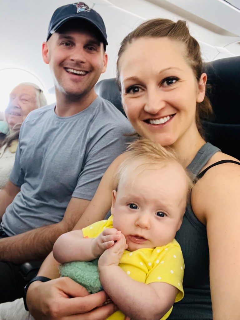 The line for bag check was already really long at the airport, but we got to skip to the attendant area since we had Harper and our bags were checked pretty quickly. We walked past the longest line I’ve ever seen to get through security to the short TSA Pre line. Somehow, Ryan’s ticket didn’t have TSA Pre on it, so Harper and I went through while Ryan ran back to the gate agent to get his ticket reprinted. Going through security was not too hard but, when people say “wear your baby through it”, do it! You need both hands to break down your stroller and car seat and manage all of your bags. Fortunately, a nice man helped me get everything into the scanner. Harper and I grabbed Starbucks while Ryan got through and then we went to the gate to check the stroller. I tried to board but the agent said I needed a ticket for Harper. I thought we had one since I booked the trip with a lap child, but we had to go back to the gate agent for 15 minutes of unchecking and rechecking-in. Thankfully, we kept our row 4 seats.