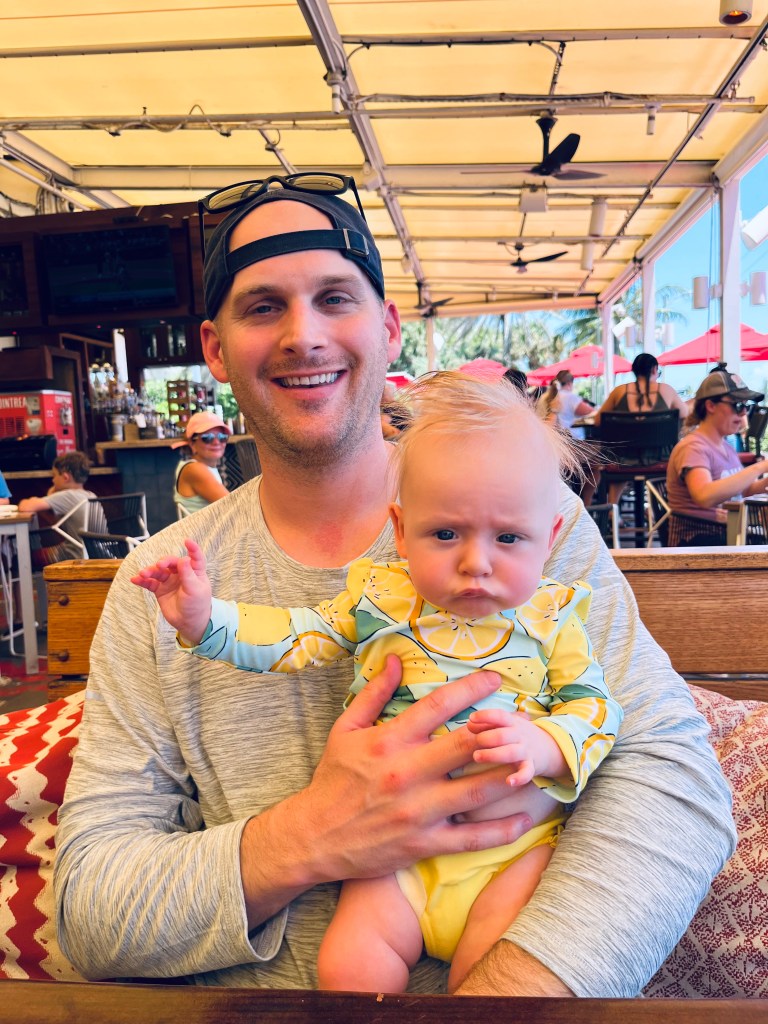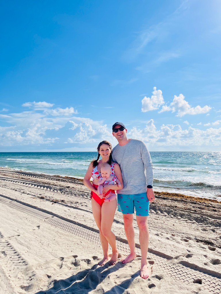6:15 AM wake-ups were never a thing on trips in the past but, with a baby and pumping schedule, now they are! It was really nice to get an early start with some coffee on the patio. After enjoying some muffins and cuddle time with Harper, we took off on a morning beach side stroll. It was in the 80’s but not hot. We walked to a CVS to get some additional supplies and came back to grab our massive beach bag to head to the beach.